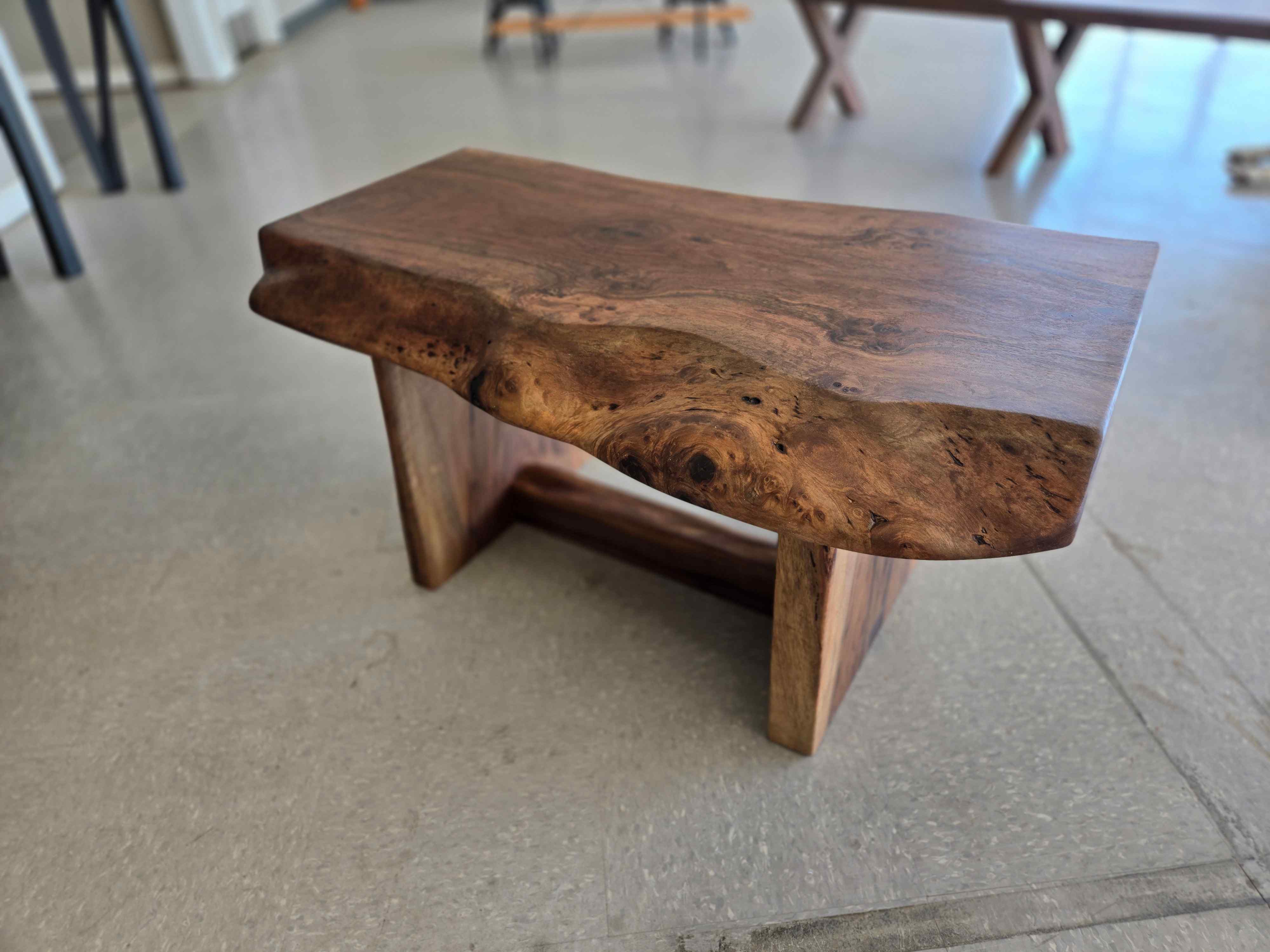 We primarily use salvaged, reclaimed, or repurposed local hardwoods from Northern California, such as eucalyptus, English walnut, cherry, maple, olive wood and more, emphasizing sustainable practices.